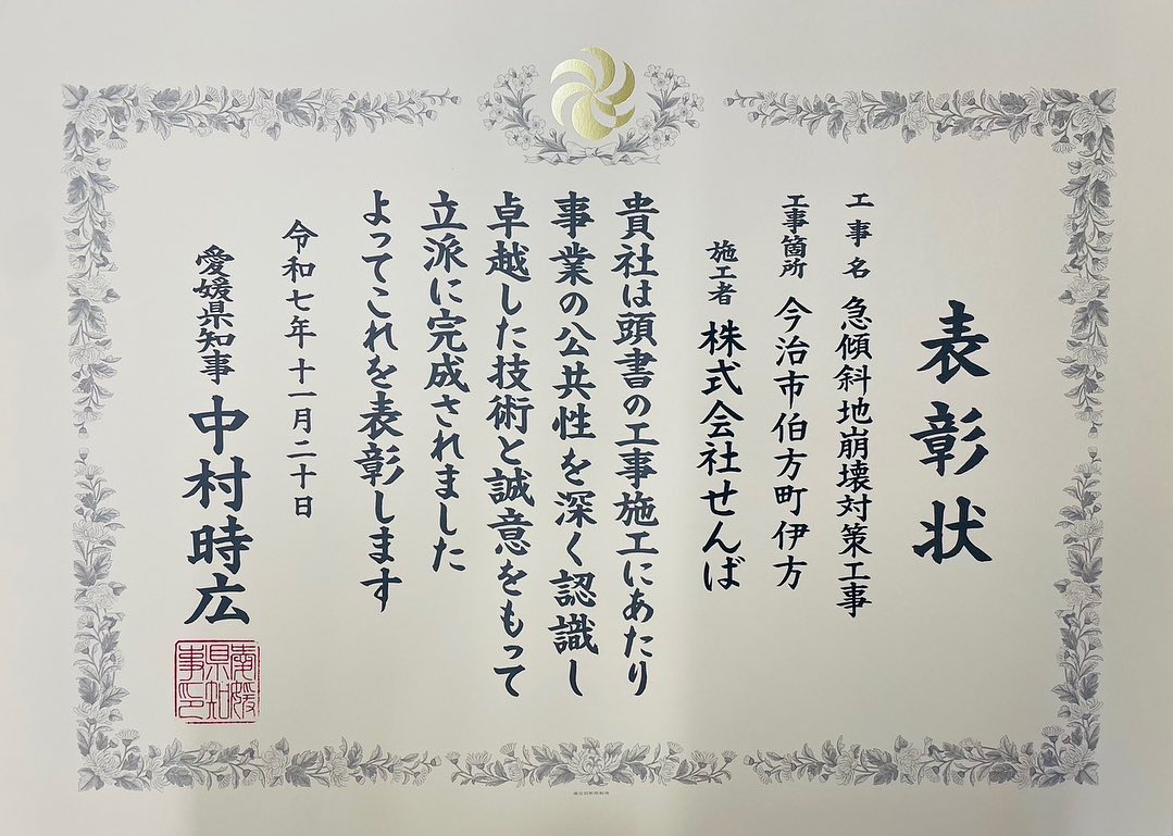 . 昨年弊社の中村部長が担当した工事が 令和7年度愛媛県優良建設工事として選出され、 知事表彰を賜りました🎉 現在も継続工事の施行中です。 だんだん寒くなってきましたが、 従業員のみなさん いつもありがとうございます🙇♂️ 地域の皆様には引き続きご迷惑をおかけしますが、 今後ともよろしくお願いいたします👷♂️ #今治市 #伯方島 #建設業